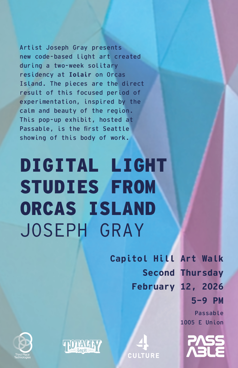 Artist Joseph Gray presents new code-based light art created during a two-week solitary residency at Iolair on Orcas Island. The pieces are the direct result of this focused period of experimentation, inspired by the calm and beauty of the region. This pop-up exhibit, hosted at Passable, is the first Seattle showing of this body of work.